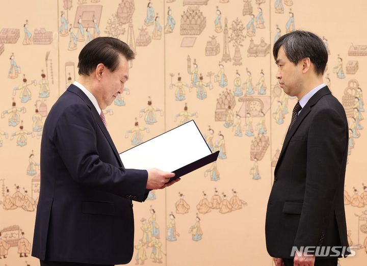 [서울=뉴시스] 조수정 기자 = 윤석열 대통령이 14일 서울 용산 대통령실 청사에서 최슬기 저출산고령사회위원회 상임위원에게 위촉장을 수여하고 있다. (대통령실통신사진기자단) 2024.02.14. [email protected]