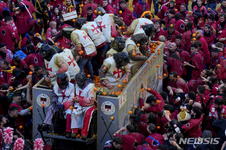 [이브레아=AP/뉴시스] 지난 13일(현지시각) 이탈리아 북부 피에몬테주 이브레아에서 '오렌지 전투 축제'가 열려 중세 병사와 평민으로 분장한 사람들이 '오렌지 전투'를 벌이고 있다. 12세기 봉건시대에 평민인 비올레타라는 여성이 자신에게 '초야권'을 행사하려던 영주의 목을 베면서 민중 봉기를 촉발한 것이 '오렌지 전투'의 기원으로 알려져 있다. 축제에 소비되는 오렌지는 식용에 부적합한 것들로 후에 퇴비로 이용된다. 2024.02.15.