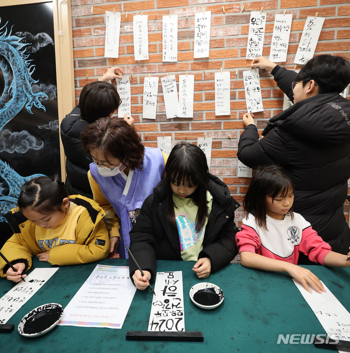 [인천=뉴시스] 전진환 기자 = 정월대보름을 나흘 앞둔 20일 오후 인천 연수구 교육문화복합공간 '마을엔'에서 어린이들이 선생님의 설명을 들으며 소원지를 적고 있다. 2024.02.20. [email protected]