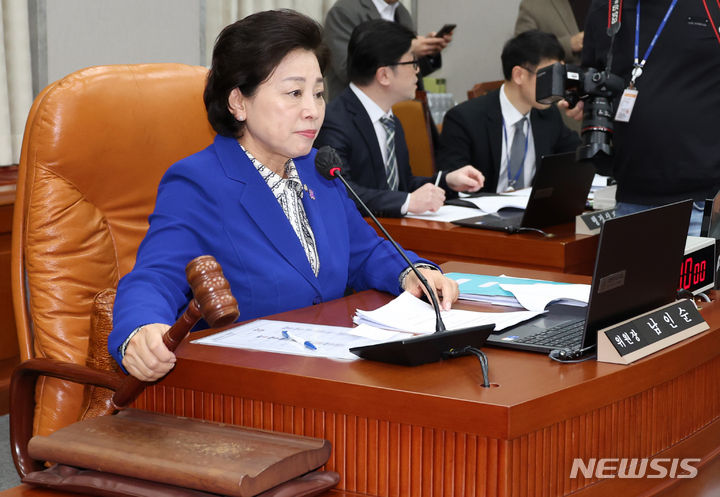 [서울=뉴시스] 이영환 기자 = 남인순 국회 정치개혁특별위원장이 29일 오후 서울 여의도 국회에서 열린 전체회의에서 안건을 상정하며 의사봉을 두드리고 있다. 2024.02.29. [email protected]
