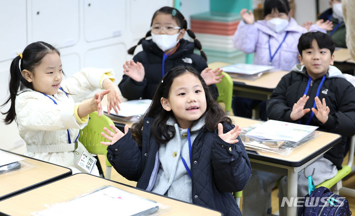 [대구=뉴시스] 이무열 기자 = 4일 오전 대구 달서구 대구한실초등학교에서 입학식을 마친 신입생 어린이들이 교실에서 담임선생님과 인사를 나누고 있다. 2024.03.04. [email protected]