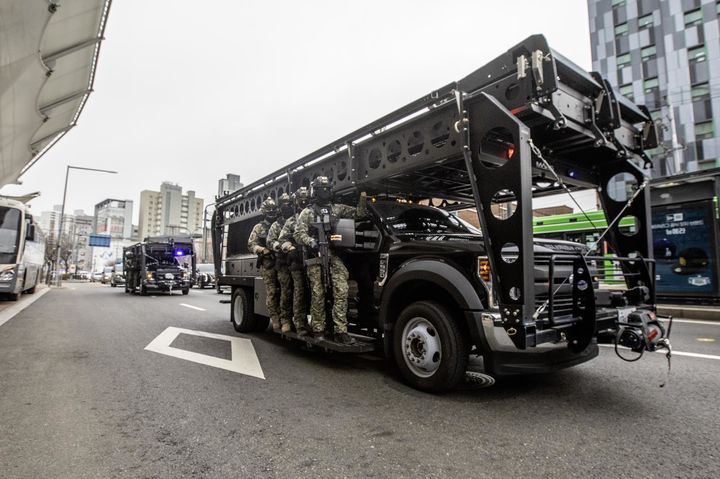 [서울=뉴시스] 육군 특수전사령부 백호부대가 5일 작전차량을 이용해 서울 구로구 고척스카이돔으로 기동하고 있다. 백호부대는 이날 고척스카이돔에서 24 FS/TIGER 일환으로 다중이용시설 대테러훈련을 실시했다. (사진=육군 제공) 2024.03.05. [email protected] *재판매 및 DB 금지