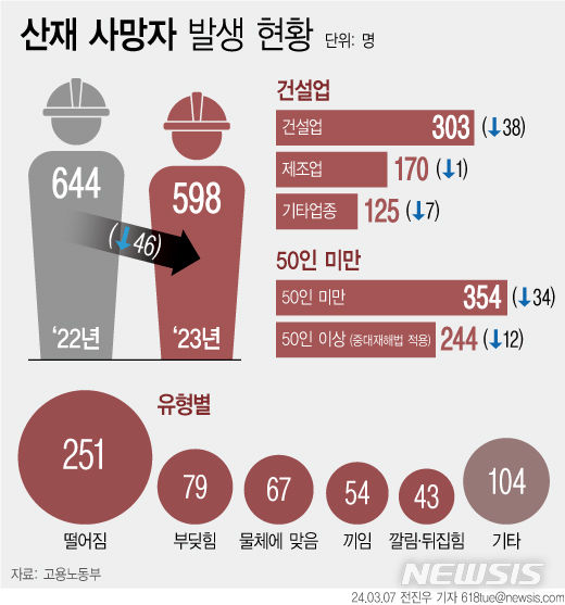 [서울=뉴시스] 7일 고용노동부에 따르면 지난해 산재 사고로 숨진 노동자는 총 598명(사고 건수 584건)이다. 이는 전년 대비 46명(7.1%) 감소한 것으로, 산재 사고 사망자 수가 역대 가장 낮은 500명대에 진입한 것은 재해 발생일을 기준으로 통계가 집계된 2021년 이후 처음이다. (그래픽=전진우 기자)