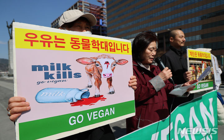 [서울=뉴시스] 김금보 기자 = 한국동물보호연합 활동가들이 8일 오전 서울 종로구 광화문광장에서 '국제 여성의 날 맞이 비인간 여성 동물 착취 중단을 촉구하는 기자회견'을 열고 성명서를 낭독하고 있다. 2024.03.08. [email protected]