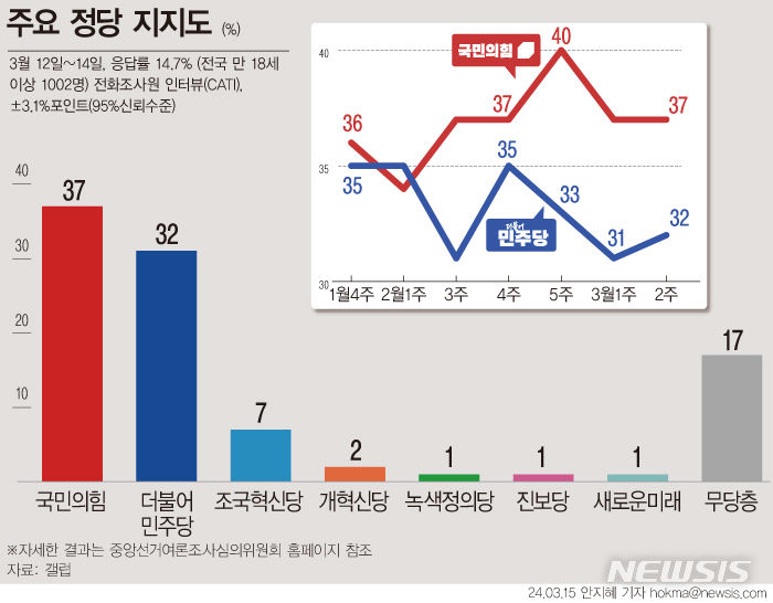 [서울=뉴시스] 한국갤럽이 3월 둘째 주 정당 지지율을 조사한 결과에 따르면 국민의힘과 더불어민주당의 정당 지지도는 각각 37%, 32%로 집계됐다. 이어 조국혁신당은 7%, 개혁신당 2%, 녹색정의당·새로운미래·자유통일당·진보당은 각각 1%로 나타났다. 지지하는 정당이 없는 무당층은 17%다. (그래픽=안지혜 기자)