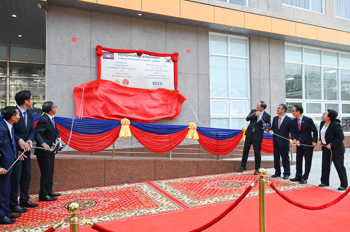 [서울=뉴시스] 조수정 기자 = 14일 오전(현지시각) 캄보디아 수도 프놈펜 왕립프놈펜대학교에서 열린 국립창업보육센터 개소식에 참석한 내외빈들이 현판을 제막하고 있다. 왼쪽부터 찌읏 찌을리 왕립프놈펜대학교 총장, 산 바타나 왕립프놈펜대학교 이사장, 항 추온 나론 교육부총리, 장원삼 코이카 이사장, 안완기 한국생산성본부 회장, 박정욱 주캄보디아 대한민국 대사, 최문정 코이카 캄보디아 사무소장. (사진=코이카 제공) 2024.03.17. [email protected] *재판매 및 DB 금지