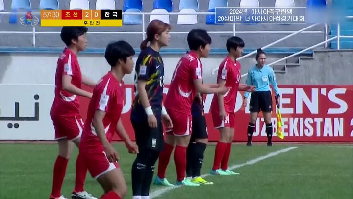 [서울=뉴시스] 조선중앙TV가 17일 지난 13일 열린 20세 이하(U-20) 여자축구 아시안컵 준결승 남북 대결 경기 영상을 녹화 중계하면서 우리나라를 '한국', 북한을 '조선'으로 표기했다. 북한 관영 매체들은 지난해 하반기부터 한국을 지칭하며 '괴뢰', '괴뢰한국', '한국괴뢰' 등의 표현을 자주 사용했다. (사진=조선중앙TV 캡처) 2024.03.17. [email protected] *재판매 및 DB 금지