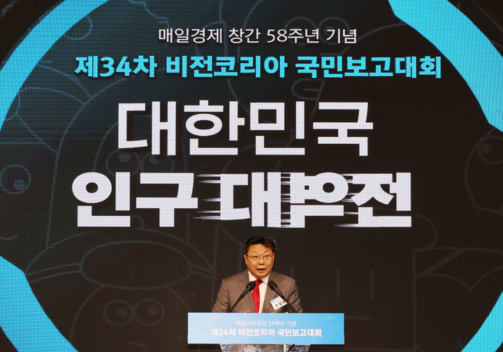 [서울=뉴시스] 주형환 저출산·고령사회위원회(저고위) 부위원장이 20일 서울 신라호텔에서 대한민국인구대역전을 주제로 열린 제34차 비전코리아 국민보고대회에서 강평을 하고 있다. (사진=매일경제신문 제공) 2024.03.20. [email protected]