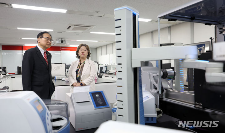 [서울=뉴시스] 김선웅 기자 = 정인교 산업통상자원부 통상교섭본부장이 28일 서울 강남구 소재 글로벌 생명과학 기업 써모피셔 사이언티픽코리아를 방문해 고객경험센터 내 각종 시설·장비에 관한 설명을 듣고 있다. 이날 정인교 본부장은 써모피셔社 마크 스메들리 부회장과 만나 바이오 원부자재 생산시설의 한국 투자 유치를 협의했다. 2024.03.28. [email protected]