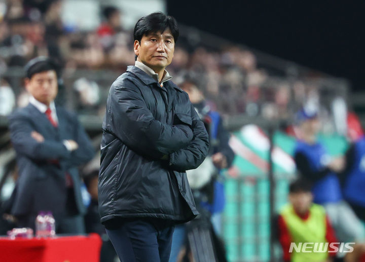 [서울=뉴시스] 황준선 기자 = 3일 서울 마포구 서울월드컵경기장에서 열린 프로축구 하나원큐 2024 K리그1 5라운드 FC서울과 김천상무 프로축구단의 경기, 정정용 김천상무 감독이 경기를 지켜보고 있다. 2024.04.03. [email protected]
