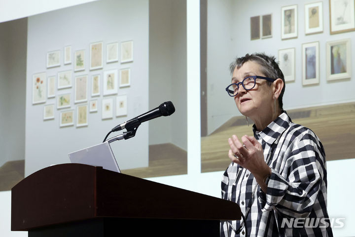 [서울=뉴시스] 최동준 기자 = 영국 테이트모던 미술관 명예관장인 프란시스 모리스 이화여자대학교 초빙석좌교수가 11일 서울 서대문구 이화여자대학교 중강당에서 '테이트 모던 : 변혁의 생태학'이라는 주제로 특강하고 있다. 2024.04.11. [email protected]