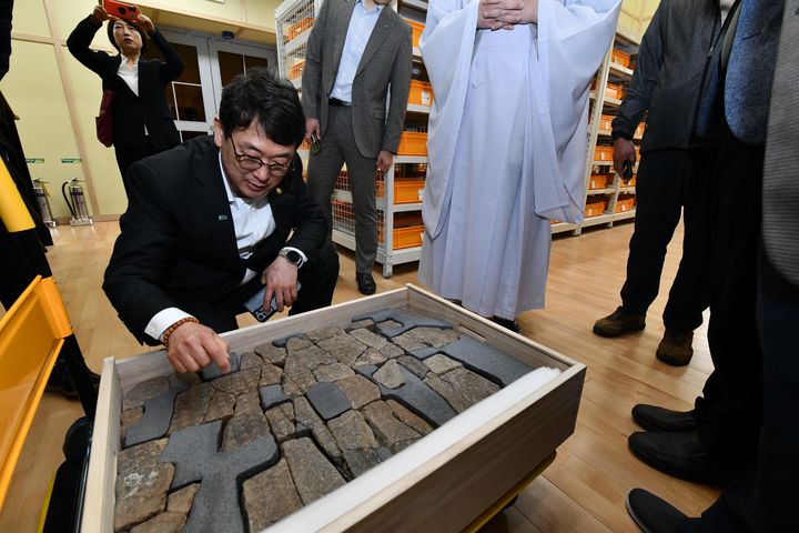 [서울=뉴시스] 최응천 문화재청장이 12일 전남 구례 화엄사 화엄석경관을 방문해 석판 조각을 살펴보고 있다. (사진=문화재청 제공) 2024.04.12. [email protected] *재판매 및 DB 금지
