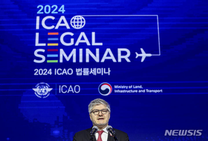 [서울=뉴시스] 정병혁 기자 = 후안 카를로스 살라자르 ICAO 사무총장이 16일 서울 중구 롯데호텔에서 열린 2024 ICAO 법률세미나에서 개회사를 하고 있다. 2024.04.16. [email protected]