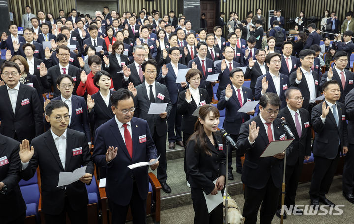 [서울=뉴시스] 조성봉 기자= 16일 서울 여의도 국회에서 열린 제22대 국회 국민의힘·국민의미래 당선자총회에서 배준영, 김예지 당선인이 결의문을 낭독하고 있다. 당선인들은 결의문을 통해 "국민을 두려워하는 마음으로 일하겠다. 민생, 경제, 외교, 안보, 또 집권 여당으로서 해야 할 일들을 한 걸음, 한 걸음 실천해 나가겠다"고 약속했다.(공동취재) 2024.04.16. [email protected]