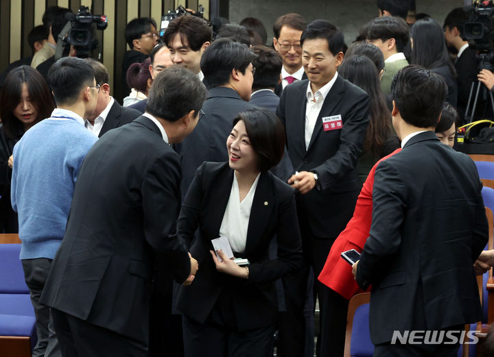 [서울=뉴시스] 조성봉 기자= 16일 오전 서울 여의도 국회에서 열린 제22대 국회 국민의힘·국민의미래 당선자총회에서 배현진 당선인이 참석자들과 인사를 나누고 있다. 2024.04.16. [email protected]