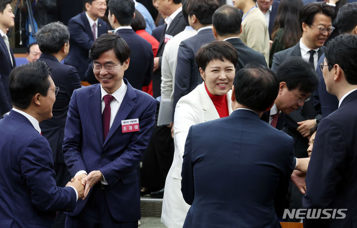 [서울=뉴시스] 조성봉 기자= 16일 오전 서울 여의도 국회에서 열린 제22대 국회 국민의힘·국민의미래 당선자총회에서 조경태(왼쪽), 김은혜 당선인이 참석자들과 악수를 하고 있다. 2024.04.16. [email protected]