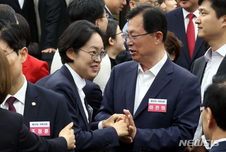 [서울=뉴시스] 조성봉 기자= 16일 오전 서울 여의도 국회에서 열린 제22대 국회 국민의힘·국민의미래 당선자총회에서 이만희, 조지연(왼쪽) 당선인이 악수를 하고 있다. 2024.04.16. [email protected]