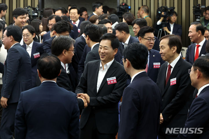 [서울=뉴시스] 조성봉 기자= 16일 오전 서울 여의도 국회에서 열린 제22대 국회 국민의힘·국민의미래 당선자총회에서 유영하 당선인이 참석자들과 인사를 나누고 있다. 2024.04.16. [email protected]