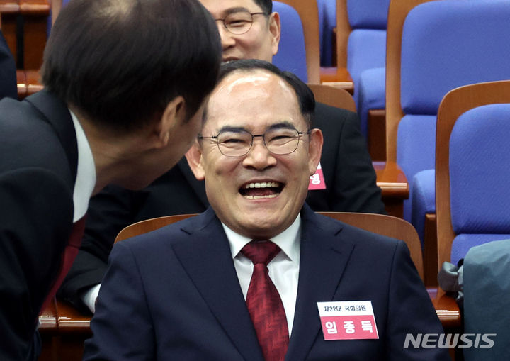 [서울=뉴시스] 조성봉 기자= 16일 오전 서울 여의도 국회에서 열린 제22대 국회 국민의힘·국민의미래 당선자총회에서 임종득 당선인이 밝은 표정을 짓고 있다. 2024.04.16. [email protected]