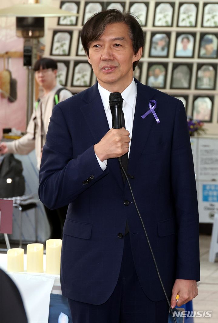 [서울=뉴시스] 조성봉 기자= 조국 조국혁신당 대표와 당선인들이 16일 오후 서울 중구 시청 서울광장에 인근에 마련된 이태원참사 희생자 합동분향소를 찾아 추모미사 참석자들에게 인사말을 하고 있다.2024.04.16. [email protected]