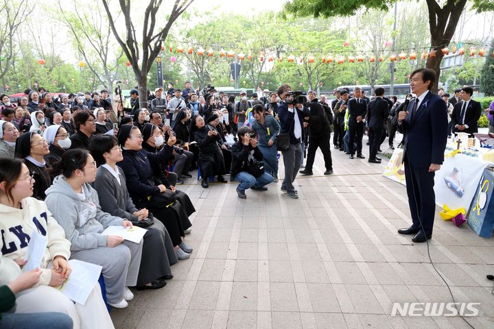 [서울=뉴시스] 조성봉 기자= 조국 조국혁신당 대표와 당선인들이 16일 오후 서울 중구 시청 서울광장에 인근에 마련된 이태원참사 희생자 합동분향소를 찾아 추모미사 참석자들에게 인사말을 하고 있다. 2024.04.16. [email protected]