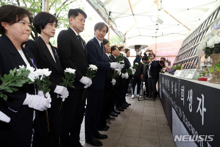 [서울=뉴시스] 조성봉 기자= 조국 조국혁신당 대표와 당선인들이 16일 오후 서울 중구 시청 서울광장에 인근에 마련된 이태원참사 희생자 합동분향소를 찾아 헌화를 하고 있다.2024.04.16. [email protected]
