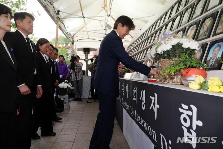 [서울=뉴시스] 조성봉 기자= 조국 조국혁신당 대표와 당선인들이 16일 오후 서울 중구 시청 서울광장에 인근에 마련된 이태원참사 희생자 합동분향소를 찾아 분향하고 있다. 2024.04.16. [email protected]