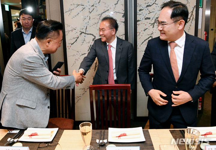 [서울=뉴시스] 국회사진기자단 = 윤재옥 국민의힘 원내대표 겸 당대표 권한대행이 17일 오후 서울 여의도 한 식당에서 열린 초선 지역구 당선자 오찬 간담회에서 참석자와 인사하고 있다. 2024.04.17. [email protected]