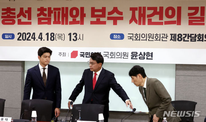 [서울=뉴시스] 조성봉 기자 = 윤상현 국민의힘 의원이 18일 오후 서울 여의도 국회 의원회관 제8간담회의실에서 열린 2024 총선 참패와 보수 재건의 길 세미나에 참석하고 있다. 왼쪽부터 김용태 당선인, 윤 의원, 박성민 정치컨설팅 '민' 대표. [email protected]