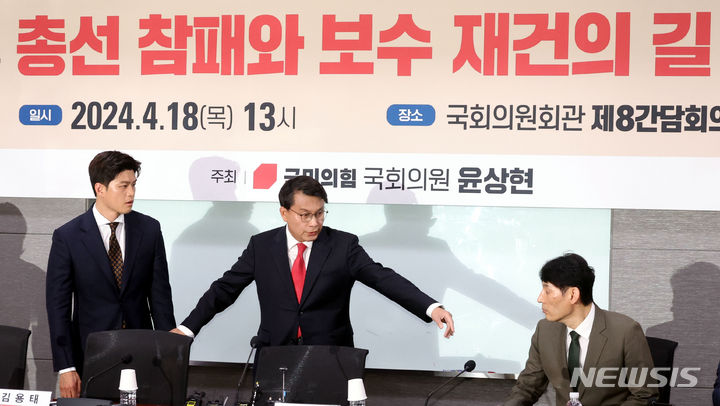 [서울=뉴시스] 조성봉 기자 = 윤상현 국민의힘 의원이 18일 오후 서울 여의도 국회 의원회관 제8간담회의실에서 열린 2024 총선 참패와 보수 재건의 길 세미나에 참석하고 있다. 왼쪽부터 김용태 당선인, 윤 의원, 박성민 정치컨설팅 '민' 대표. [email protected]