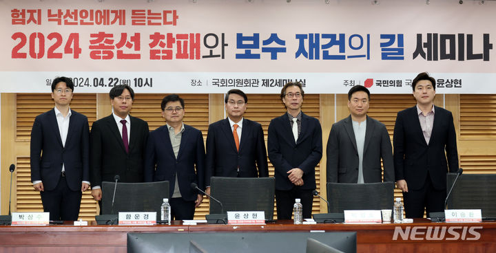 [서울=뉴시스] 이영환 기자 = 윤상현 국민의힘 의원이 22일 오전 서울 여의도 국회 의원회관에서 열린 토론회 '험지 낙선인에게 듣는다 - 2024 총선참패와 보수 재건의 길'에서 참석자들과 기념촬영을 하고 있다. 왼쪽부터 류제화 세종시갑 후보, 박상수 인천 서구갑 후보, 함운경 서울 마포구을 후보, 윤 의원, 박명호 동국대학교 정치외교학과 교수, 이승환 서울 중랑구을 후보, 박진호 경기 김포시갑 후보. 2024.04.22. [email protected]