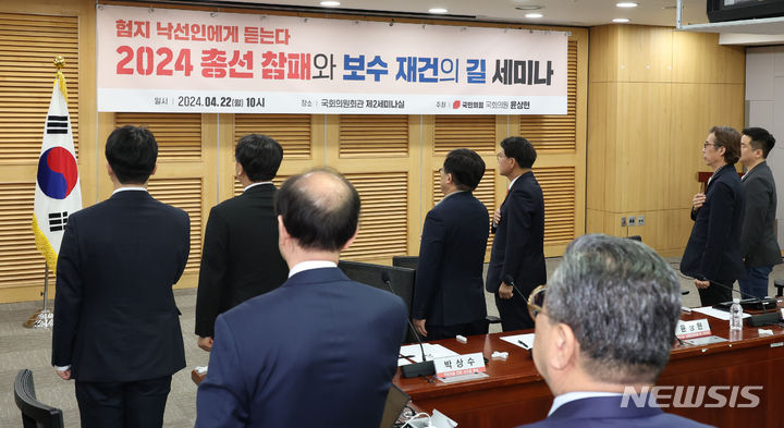 [서울=뉴시스] 이영환 기자 = 22일 오전 서울 여의도 국회 의원회관에서 열린 토론회 '험지 낙선인에게 듣는다 - 2024 총선참패와 보수 재건의 길'에서 참석자들이 국민의례를 하고 있다. 2024.04.22. [email protected]