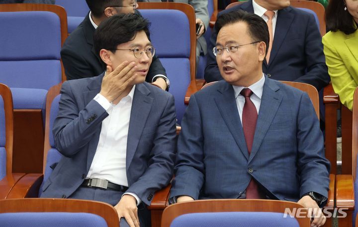 [서울=뉴시스] 조성봉 기자= 22일 오후 서울 여의도 국회에서 열린 국민의힘 제22대 국회의원 당선자 총회에서 조정훈(왼쪽) 의원과 유상범 의원이 대화를 나누고 있다. 윤재옥 원내대표 겸 당 대표 권한대행은 이날 당선자총회에서 조 의원을 총선백서TF 위원장으로 임명했다. 2024.04.22. [email protected]