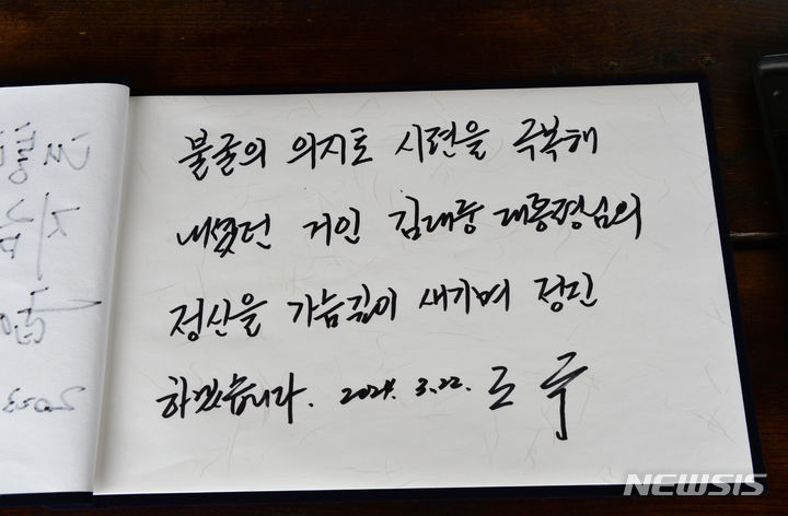 [신안=뉴시스] 박상수 기자= 23일 오후 전남 신안군 하의도 김대중 전 대통령의 생가를 방문한 조국 조국혁신당 대표가 방명록에 "김대중 정신을 가슴깊이 새기며 정진하겠습니다"고 적었다. 2024.04.23. [email protected]