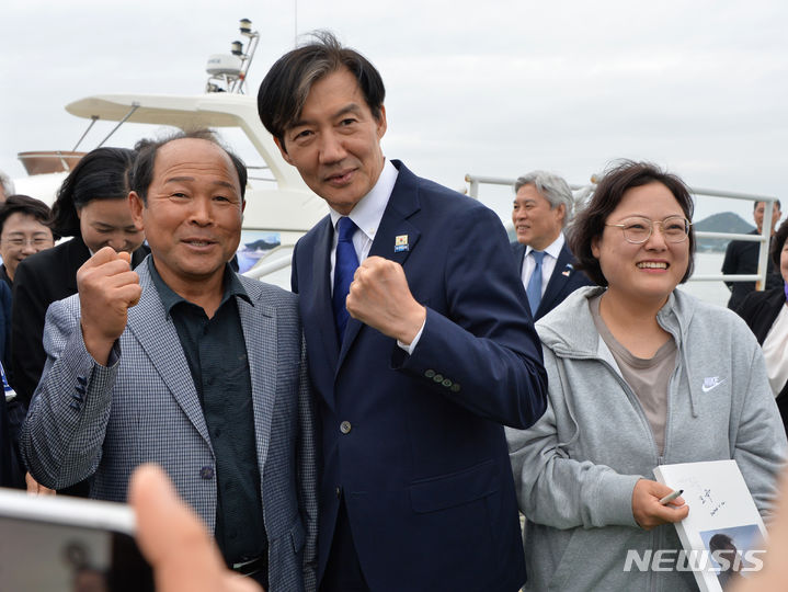 [신안=뉴시스] 박상수 기자= 23일 오후 김대중 전 대통령의 생가 방문을 위해 전남 신안군 하의도를 방문한 조국 조국혁신당 대표가 선착장에서 기다리던 지지자와 함께 주먹을 불끈 쥐고 있다. 2024.04.23. [email protected]