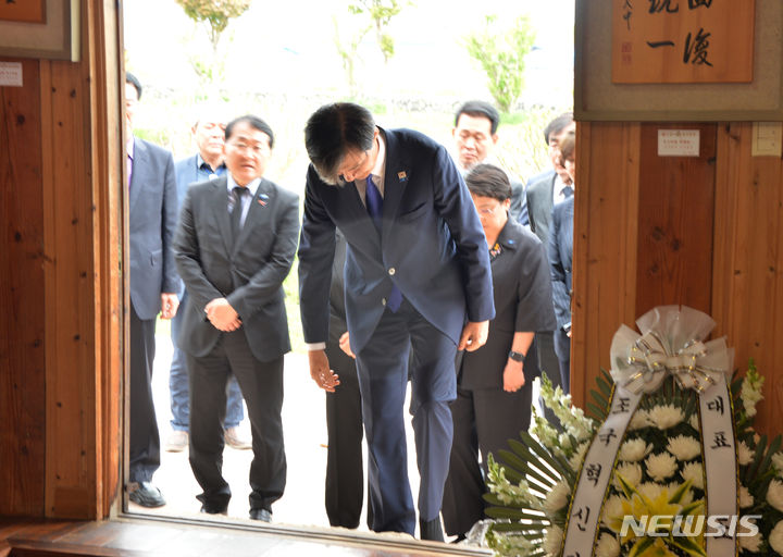 [신안=뉴시스] 박상수 기자= 23일 오후 전남 신안군 하의도를 방문한 조국 조국혁신당 대표가 김대중 전 대통령 추모관에 들어서고 있다. 2024.04.23. [email protected]