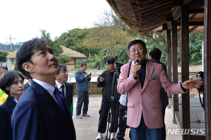 [신안=뉴시스] 박상수 기자= 23일 오후 전남 신안군 하의도 김대중 전 대통령의 생가를 방문한 조국 조국혁신당 대표가 안내자의 설명을 듣고 있다. 2024.04.23. [email protected]