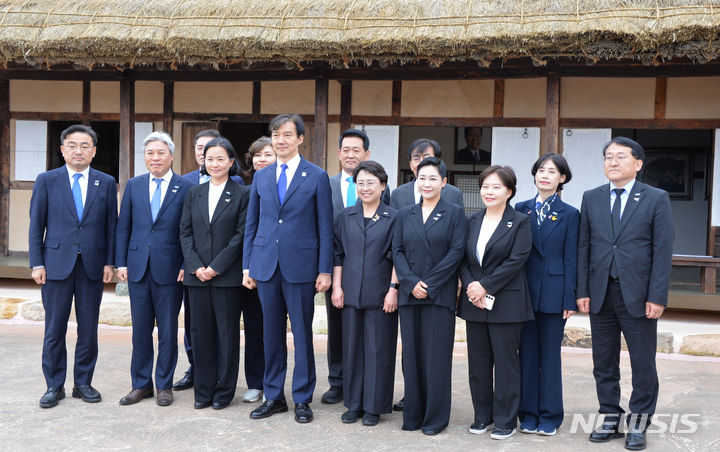 [신안=뉴시스] 박상수 기자= 23일 오후 전남 신안군 하의도 김대중 전 대통령의 생가를 방문한 조국 조국혁신당 대표와 당선인 등이 기념촬영을 하고 있다. 2024.04.23. [email protected]