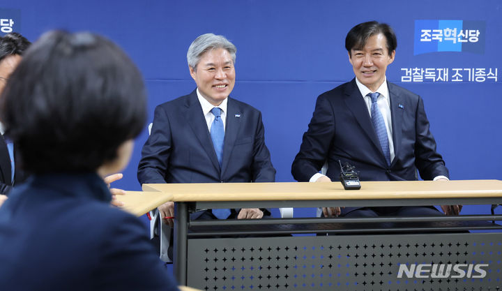 [서울=뉴시스] 추상철 기자 = 조국 조국혁신당 대표가 25일 오전 서울 여의도 조국혁신당 중앙당사에서 열린 원내대표 선출을 위한 제22대 국회의원 당선인 총회 시작전 당선인들과 대화하고 있다. 2024.04.25. [email protected]