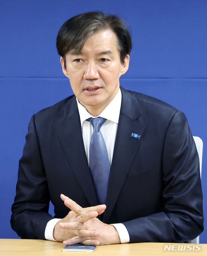 [서울=뉴시스] 추상철 기자 = 조국 조국혁신당 대표가 25일 오전 서울 여의도 조국혁신당 중앙당사에서 열린 원내대표 선출을 위한 제22대 국회의원 당선인 총회에 참석해 당선인과 대화하고 있다. 2024.04.25. [email protected]