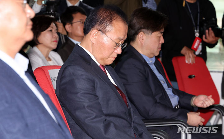 [서울=뉴시스] 추상철 기자 = 윤재옥 국민의힘 당대표 권한대행 겸 원내대표가 25일 오전 서울 여의도 국민의힘 중앙당사에서 열린 '제22대 총선이 남긴 과제들' 총선평가 토론회에서 휴대폰을 보고 있다. 2024.04.25. [email protected]