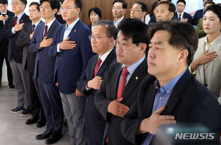 [서울=뉴시스] 추상철 기자 = 윤재옥(앞줄 오른쪽 세번째) 국민의힘 당대표 권한대행 겸 원내대표가 25일 오전 서울 여의도 국민의힘 중앙당사에서 열린 '제22대 총선이 남긴 과제들' 총선평가 토론회에서 국민의례를 하고 있다. 2024.04.25. [email protected]