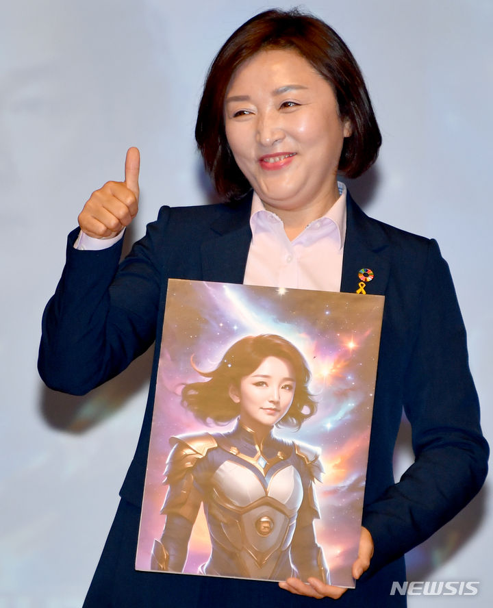[광주=뉴시스] 류형근 기자 = 25일 오전 광주 서구 광주시청 대회의실에서 제22대 국회의원 선거 광주지역 당선인 초청 행사가 열리고 있다. 전진숙 광주 북구을 당선인이 캐리커쳐를 선물받고 기념사진을 찍고 있다. 2024.04.25. [email protected]