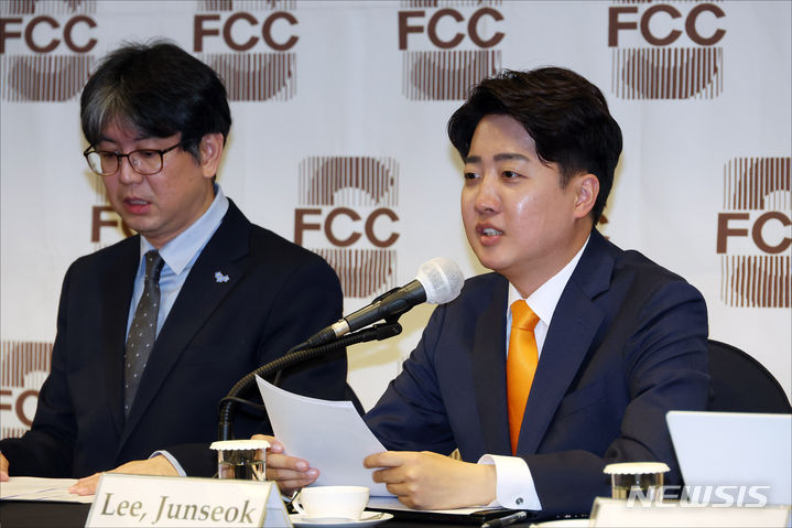 [서울=뉴시스] 국회사진기자단 = 이준석 개혁신당 대표가 25일 오후 서울 중구 한국프레스센터에서 열린 서울외신기자클럽(SFCC) 초청 기자간담회에서 모두발언을 하고 있다. 2024.04.25. [email protected]
