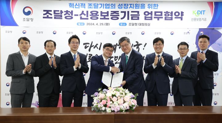 [대전=뉴시스] 김양수 기자 = 29일 임기근 조달청장(왼쪽 네번째)이 정부대전청사에서 최원목 신용보증기금 이사장과 업무협약을 체결한 뒤 양기관 관계자들과 기념촬영을 하고 있다. 이 협약으로 보증료 차감혜택이 혁신제품과 벤처나라 지정 기업에서 우수조달물품 및 해외조달시장 진출 유망기업(G-PASS)까지 확대됐다.(사진=조달청 제공).2024.04.29. [email protected]