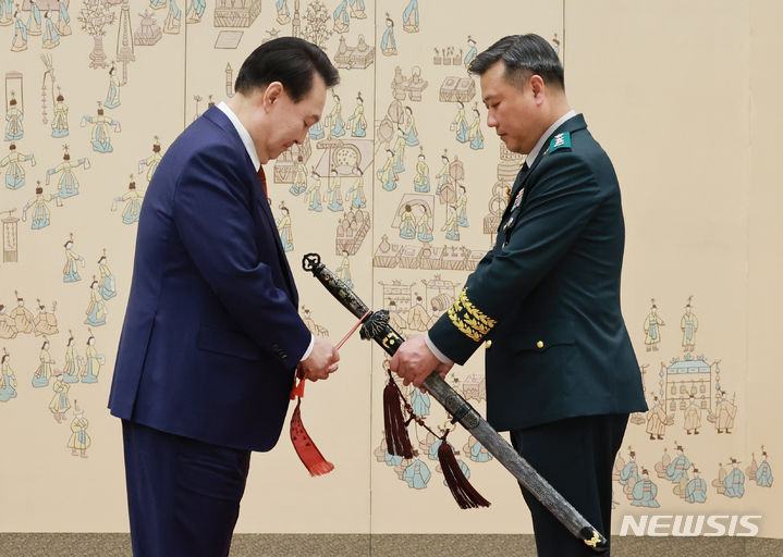 [서울=뉴시스] 전신 기자 = 윤석열 대통령이 1일 서울 용산 대통령실 청사에서 열린 중장 진급·보직 신고 및 삼정검 수치 수여식에서 박재열 신임 7군단장의 삼정검에 수치를 달아주고 있다 (대통령실통신사진기자단) 2024.05.01. [email protected]