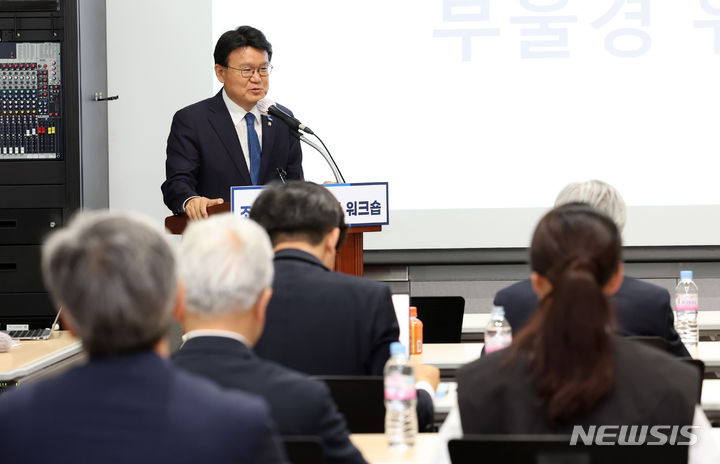 [부산=뉴시스] 하경민 기자 = 황운하 조국혁신당 원내대표가 3일 부산 동구 부산항국제전시컨벤션센터에서 열린 조국혁신당 당선자 워크숍에 참석, 인사말을 하고 있다. 2024.05.03. [email protected]