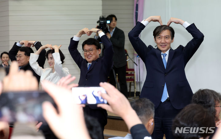 [부산=뉴시스] 하경민 기자 = 조국 조국혁신당 대표가 3일 부산 동구 부산일보사 대강당에서 열린 조국혁신당 부산·울산·경남 제22대 총선 승리 보고대회에 참석해 당선인들과 함께 지지자들에게 손하트를 만들어 보이고 있다. 2024.05.03. [email protected]