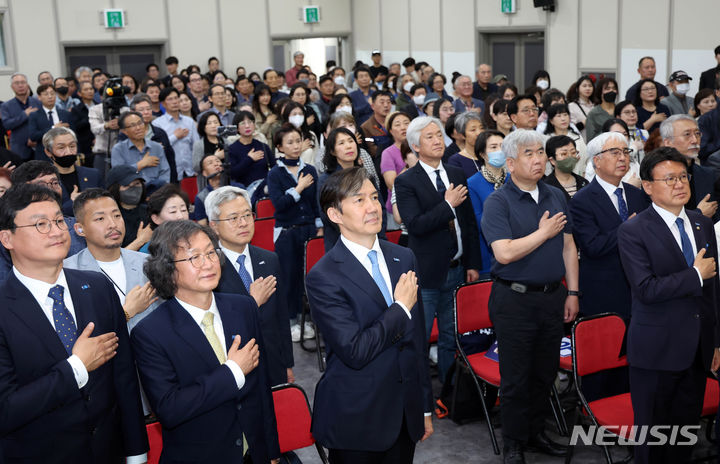 [부산=뉴시스] 하경민 기자 = 조국 조국혁신당 대표가 3일 부산 동구 부산일보사 대강당에서 열린 조국혁신당 부산·울산·경남 제22대 총선 승리 보고대회에 참석해 당선인들과 국민의례를 하고 있다. 2024.05.03. [email protected]