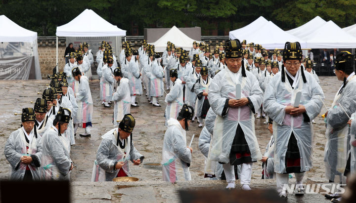 [서울=뉴시스] 홍효식 기자 = 종묘대제봉행위원회가 5일 오후 서울 종로구 종묘 영녕전에서 열린 2024 종묘대제에서 제향을 봉행하고 있다. 2024.05.05. [email protected]